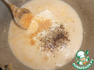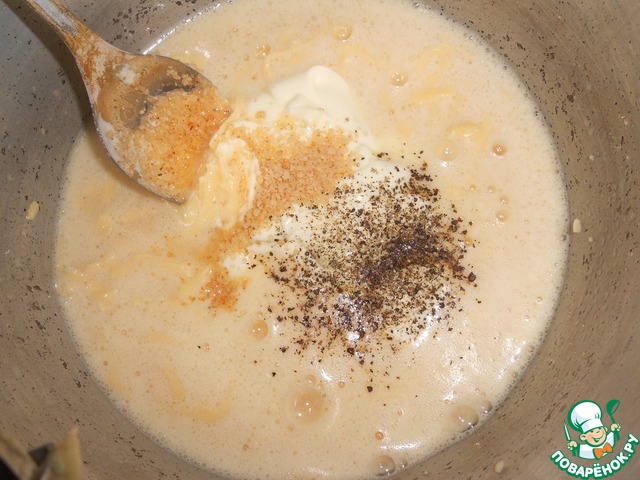 Добавляем майонез, смешиваем, солим, перчим, вводим постепенно муку, смешиваем