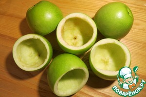 Теперь нам нужно сделать "чашечки" из яблок. Это удобно делать ложкой для шариков мороженого. Стенку яблока оставляем около 0,5 см., на глаз. Вычищаем вместе с семечками в отдельную миску, потом всё лишнее срежем.