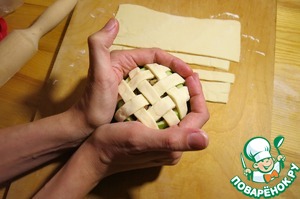 После того, как решётка на яблоке готова, приминаем тесто руками к яблоку.