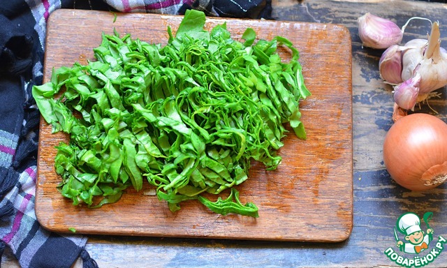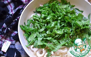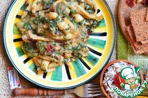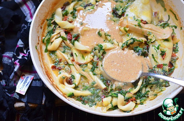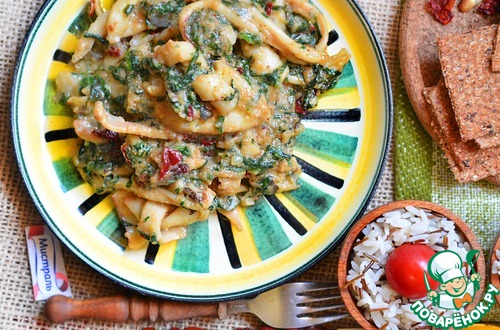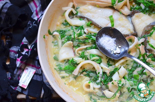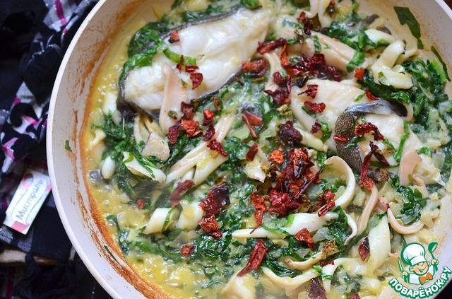 5. Кальмары и рыба пустят сок. Протушить их в этом соке. Если у вас "сухая" рыба, то добавьте полстакана воды. Добавить шпинат.
