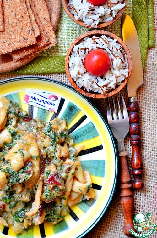 Sauce Pate D'arachide. Африку без их необычных соусов представить невозможно. Почему именно этот соус? Потому что это один из немногих соусов, которые можно приготовить у нас и за экзотикой вкуса на далёкий континент ехать не надо. Я адаптировала рецепт к нашим продуктам, добавив шпинат вместо saka-saka. Убрала бульонный кубик (в рецептах африканских дам, он незаменимая часть любого соуса). Убрала из рецепта кусочки говядины, дабы не смущать читателей рунета сочетанием говядина-рыба-кальмар. Хотя хочу заметить, что вкусно. Оставила в рецепте соду для размягчения и именно того, важного вкусового оттенка. Экзотику подаём с экзотикой. Акватика Mix от Мистраль придаст ещё большей загадочности и антуражу.
