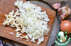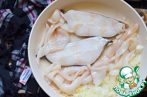 4. Кладём лук и чеснок в сковороду, в растительное масло и обжариваем до слегка золотистой корочки. Когда они обжарятся, рядом выкладываем рыбу и нарезанные длинными полосами кальмары.