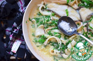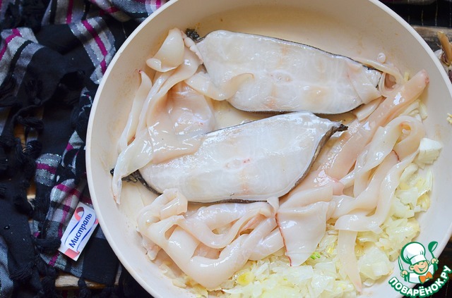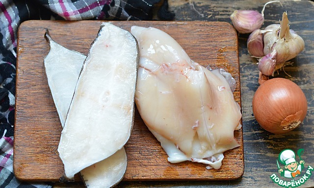 Для соуса я взяла два куска рыбы (зубатка) и две тушки кальмара.