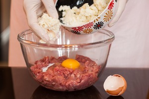 Приготовить фрикадельки. Три кусочка хлеба размочить в молоке и, не отжимая, добавить в фарш. Перемешать. Вбить яйцо, посолить, поперчить и тщательно вымесить. Фарш надо вымешивать не менее 5 мин. Тогда у фрикаделек будет плотная и одновременно нежная текстура.
