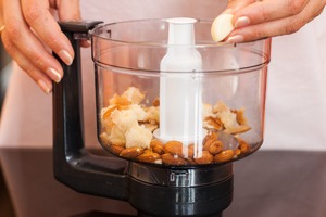 Обжаренный миндаль и чеснок измельчить в процессоре вместе с корочками от батона, оставшимися после приготовления фрикаделек.