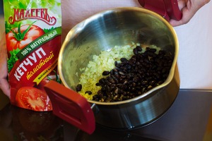 Добавить к луку консервированную фасоль вместе с кетчупом, перемешать и обжарить. Уменьшить огонь.
