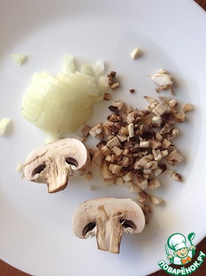 Тем временем нарезаем мелкими кубиками половину небольшой луковицы и парочку шампиньонов.