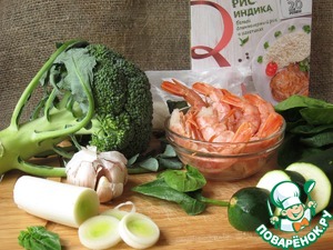 Вкусное яркое блюдо с сочными креветками и целой палитрой зеленых овощей - брокколи, цуккини, луком-порей и шпинатом! Готовится в мгновение "вока")))