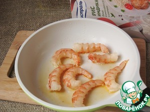 В сковороде разогреть масло, кинуть раздавленный зубчик чеснока, когда чеснок начнет сильно румяниться удалить его из сковороды, а в чесночном масле обжарить креветки 1-2 минуты. Выложить креветки в миску.