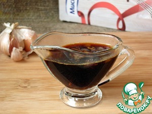 Для соуса смешать 2 ст. л. соевого соуса и 3 ст. л. бульона и измельченный зубчик чеснока. -