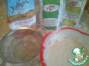 Для начала сделаем коротковременную опару: смешаем воду, дрожжи, сахар, растительное масло и немного муки. Пусть минут 15 побродит. Как я уже отмечала, взяла 3 вида муки, так как мужу больше нравится выпечка не белая, а из "живой" муки, как он ее называет.