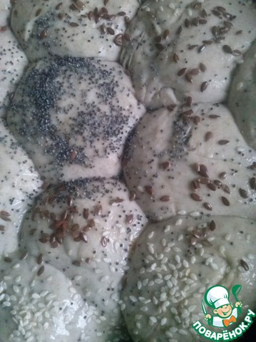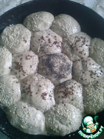 Даем булочкам постоять в теплом месте минут 20-30. Только после этого смазываем их яйцом и посыпаем чем-то вкусненьким. Я брала кунжут, льняное семя и мак))