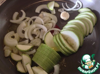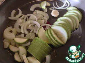 Разогреваем сковороду и поджариваем нарезанные луковицу и кабачок до подрумянивания кабачка.