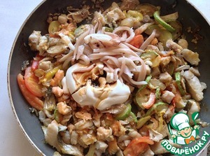 Не советую исключать из этого рецепта кальмара, он в сочетании со сметаной, чесноком и соевым соусом намного усиливаем и раскрывает вкус блюда, которое от его присутствия только выигрывает. -
