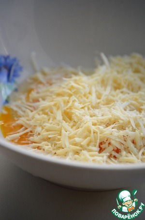 Сыр натереть на мелкой терке, растереть с яичными желтками (4шт) в однородную массу