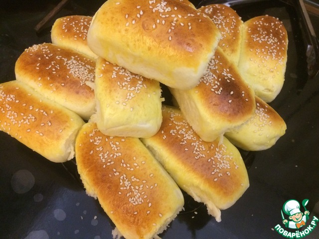 Булочкам даём отдохнуть минут 10, затем смазываем яйцом и посыпаем сверху кунжутом.