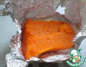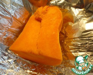 Тыкву чистим, отрезаем кусочек около 150 гр, заворачиваем в фольгу. Отправляем в разогретую до 180-200 градусов духовку.