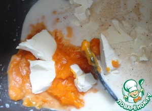 Добавляем тыквенное пюре, по щепотке соли и мускатного ореха, чайную ложку меда.