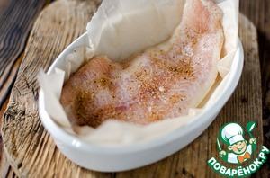 Филе Тилапии уложить в жаропрочную форму, застеленную пергаментной бумагой, посолить, поперчить и сбрызнуть оливковым маслом.