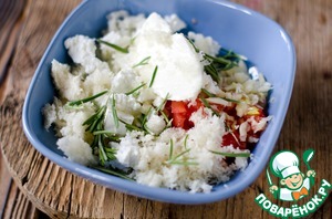 Добавить к помидорам чеснок, раскрошенную фету, йогурт, розмарин, хлебные крошки, 1 ст. л. оливкового масла, поперчить и хорошо перемешать. -