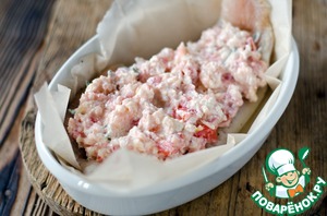 Полученную смесь уложить на рыбу и запекать ее в разогретой до 200 градусов духовке в течение 20 минут.