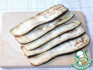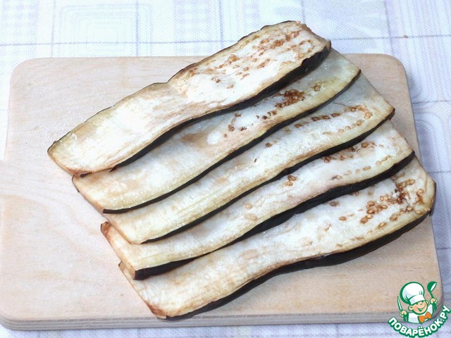 Баклажаны нарезать пластинами, поместить в миску и посолить, оставить на 30 минут.