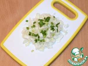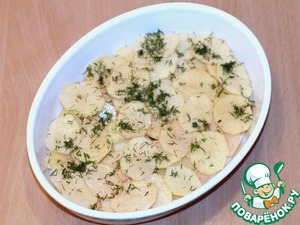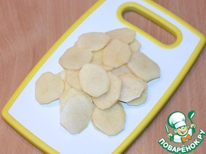 и картофель. Нарезаем лук маленькими кубиками, а картошку тонкими кольцами.