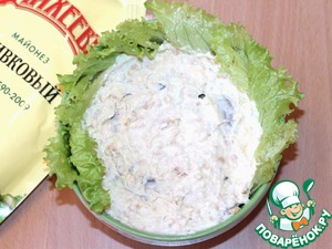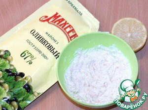 Приготовить соус, соединив майонез, измельчённый чеснок, лимонный сок, соль, толчёные орехи.