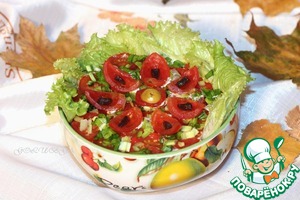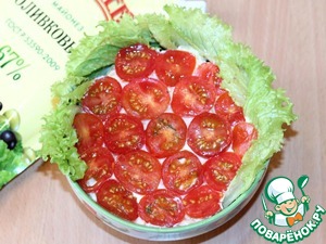 и сверху — помидоры, нарезанные кружочками. Поперчить смесью перцев.