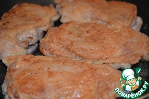 С куриных бедер удаляем лишнюю влагу с помощью бумажных полотенец. Обваливаем в муке, лишнее стряхиваем и жарим на хорошо разогретой сковороде с обеих сторон по 3 минуты.