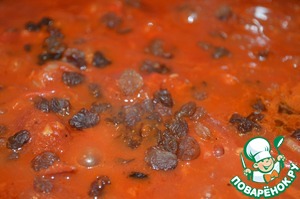 Добавляем томаты слегка из размяв, солим, вливаем бульон и даем закипеть. Засыпаем изюм.