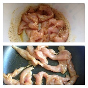 Грудку нарезать полосками и тщательно обмазать маринадом. На сильном огне вместе с маринадом обжарить курицу, 4-5 мин