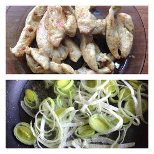 Готовое мясо выложить на тарелку. Огонь убавить до среднего и на остатках масла обжарить пару минут лук порей, нарезанный кольцами ( белая часть).
