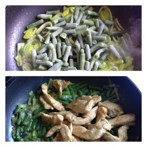 Добавить в сковороду 2 ст л масла, и к луку выложить фасоль ( у меня предварительно не размороженная). Тушить еще минут 5-7. К готовым овощам выложить кусочки курицы, огонь убрать до минимума. Все перемешать и тушить 2 мин.