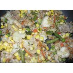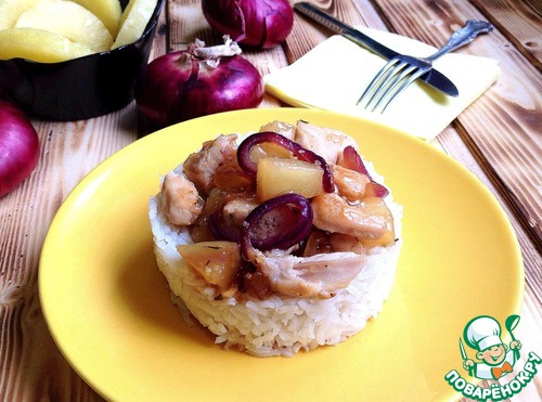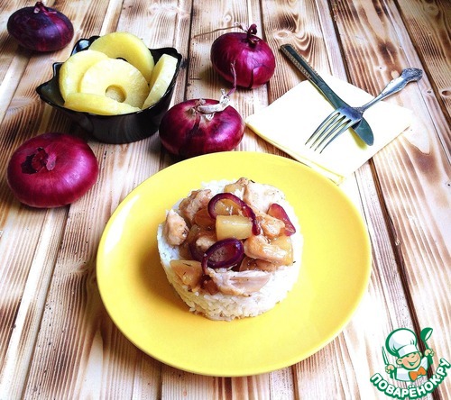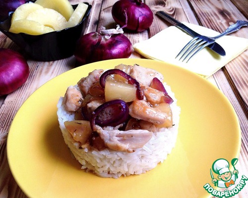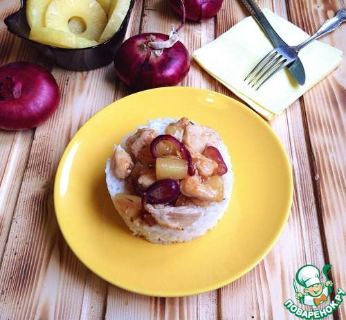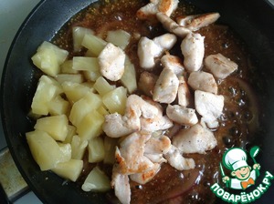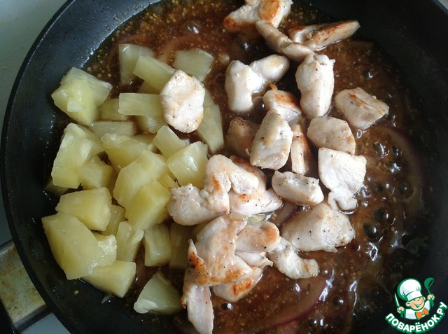 Выложь кусочки ананаса и курицу. На медленном огне потушить 2-3 мин. Готовое блюдо сервировать рисом.