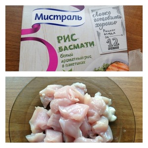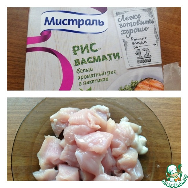 Грудку нарезать небольшими кубиками, подсолить и поперчить. Обжарить куриное филе на раскаленной сковороде в небольшом количестве оливкового масла. Не более 3-4 мин. Готовое мясо выложить на тарелку -