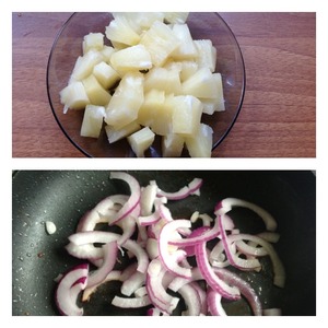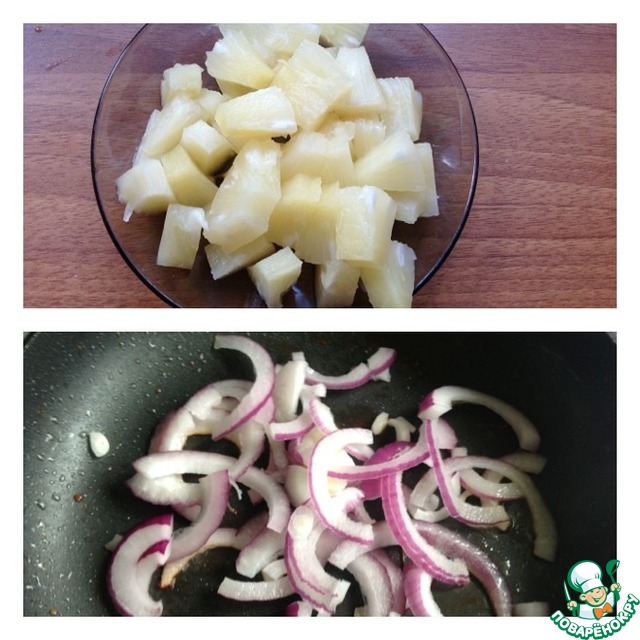 В оставшемся масле быстро обжарить лук порезанный полукольцами. Ананас порезать небольшими кусочками.