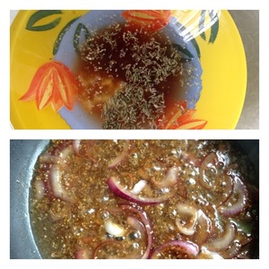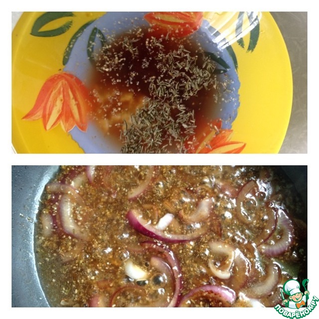 В миске смешать: ананасовый сироп, тимьян, соевый соус и крахмал. Вылить к луку. Огонь убавить до минимума, и помешивать до загустения. Около 2 мин