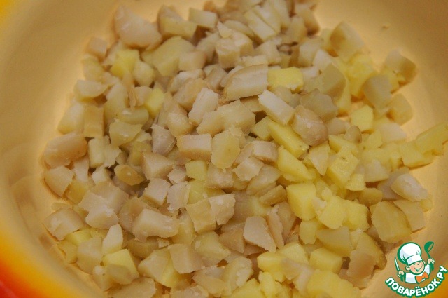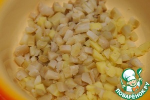 В миску выложить нарезанный небольшими кубиками картофель. -