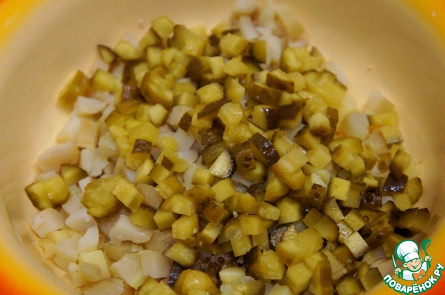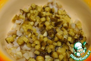 Лук нашинковать тонкими четвертьколечками, залить водой, добавить немного уксуса, чтобы маринад был кисловатым и чайную ложечку сахара. Отставить.