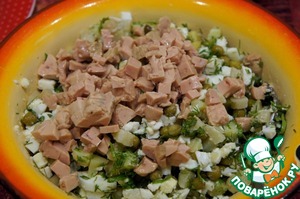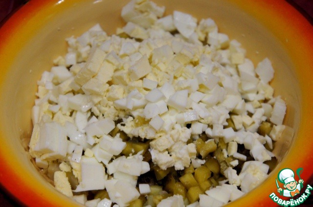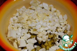 Печень вынуть из банки, несколько красивых кусочков отложить, остальное нарезать небольшими кубиками.