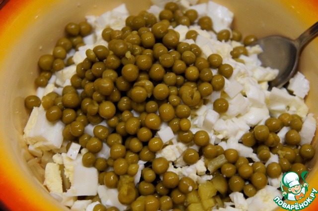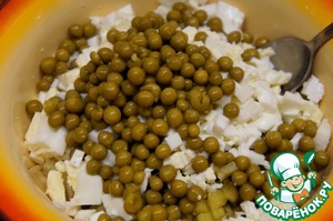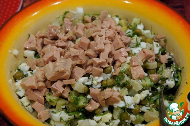 Добавить печень, полить маслом из банки и аккуратно, чтобы не помять кусочки печени, они невероятно нежные, перемешать салат.