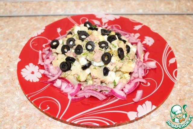 Выложить на плоскую тарелку горочкой, сверху уложить отложенные кусочки печени. Вокруг лук, который надо вынуть из маринада и отжать, и маслины, нарезанные колечками. Украсить листиками петрушки.