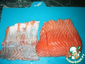 Форель нарезать на порционные кусочки так, чтобы отделить филе от кожи (у меня получилось 5 кусочков)