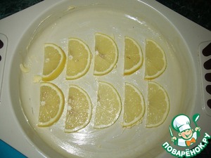 Лимон нарезать тоненькими кружочками, которые потом разрезать пополам. Уложить их в смазанную маслом форму (по 2 половинки на кусочек рыбы)