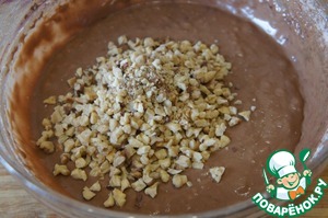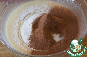 Сверху просеять муку, смешанную с разрыхлителем и какао.