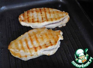 Сковороду гриль смазываем маслом (1 ст. ложка) и обжариваем грудки до полуготовности приблизительно по 3 минуты с каждой стороны.