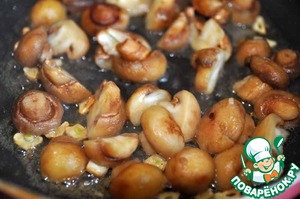 Добавляем к чесноку шампиньоны. Крупные грибы режем, мелкие оставляем целыми. Грибы можно брать как свежие, так и замороженные.
