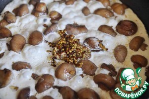 Добавляем сливки, соль и горчицу с зёрнами, перемешиваем.