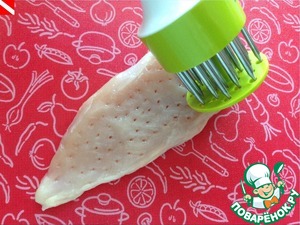Замаринованное куриное филе необходимо промокнуть бумажным полотенцем,